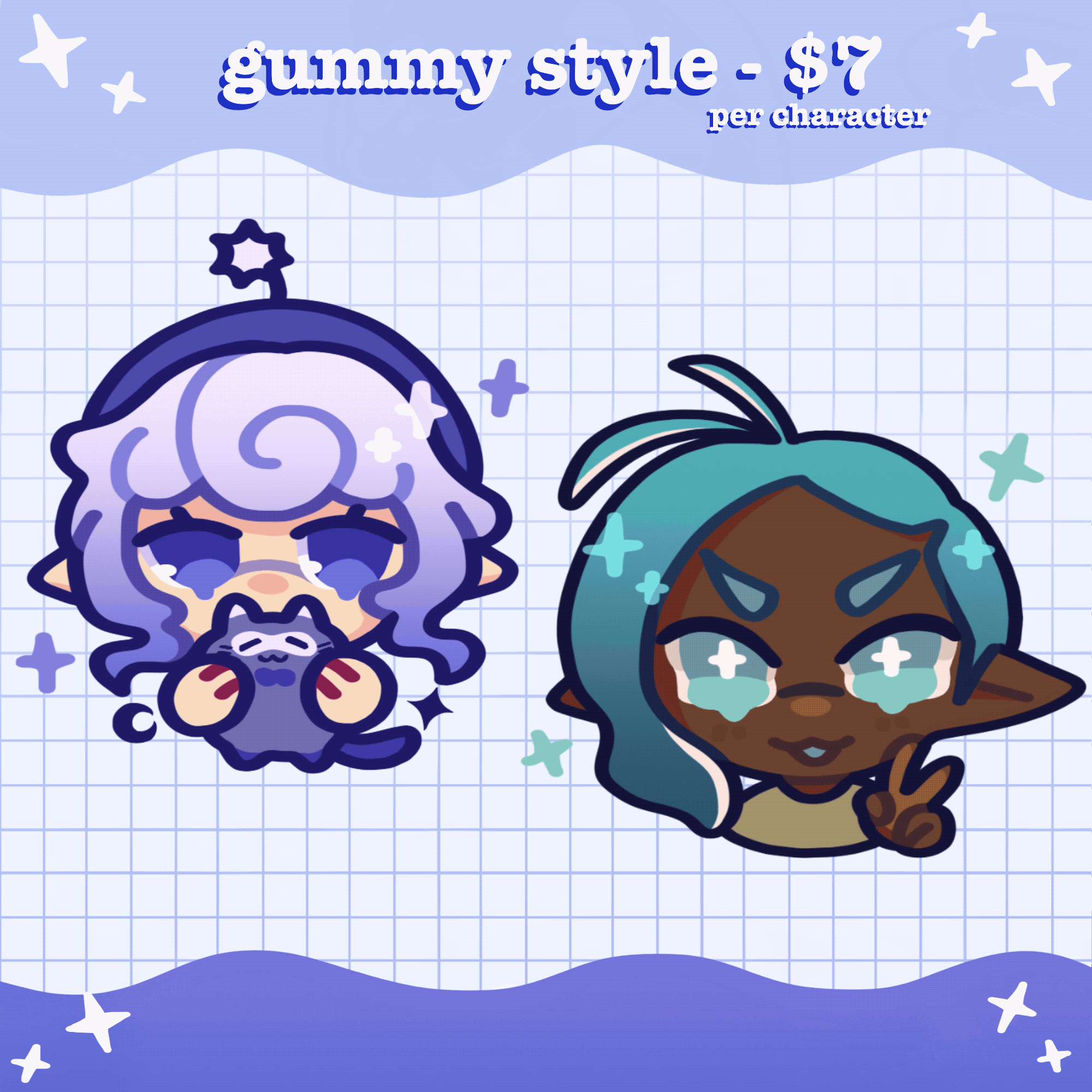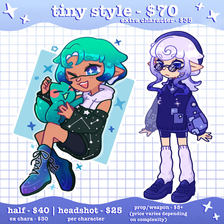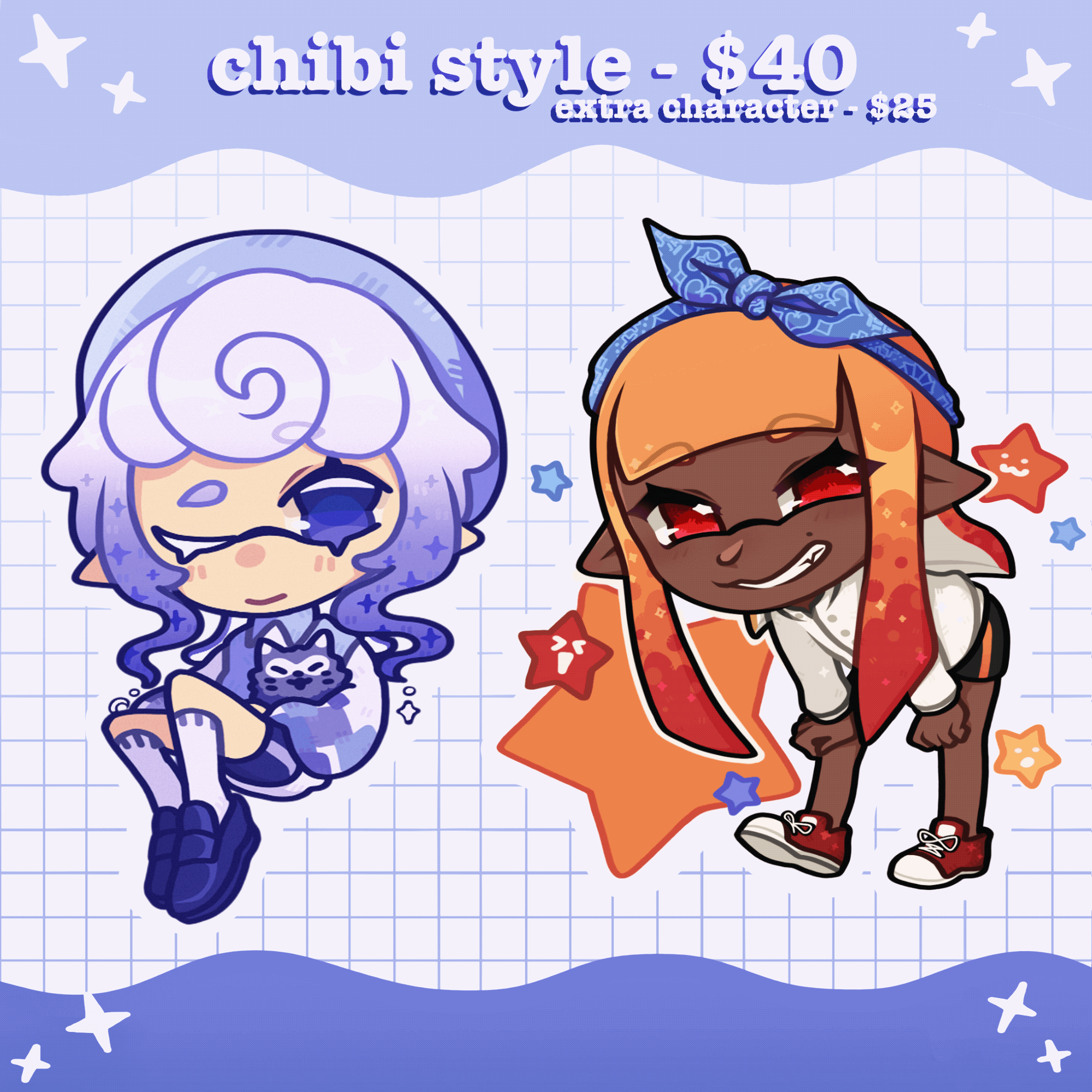 Please have some kind of reference of the character you’d like me to draw for you! If you do not have any reference i’ll do my best to draw your character from your description, though this may cost more as it may take more revisions to make the character to your liking