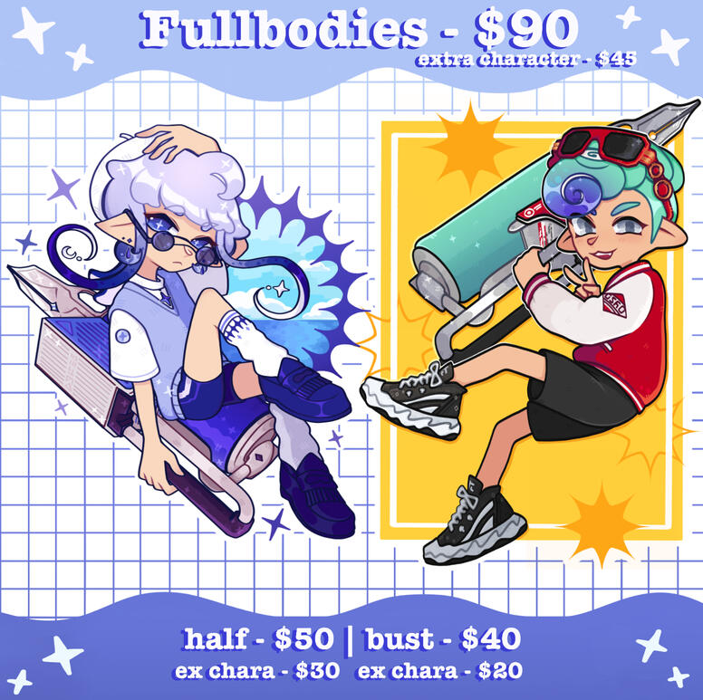 Please have some kind of reference of the character you’d like me to draw for you! If you do not have any reference i’ll do my best to draw your character from your description, though this may cost more as it may take more revisions to make the character to your liking